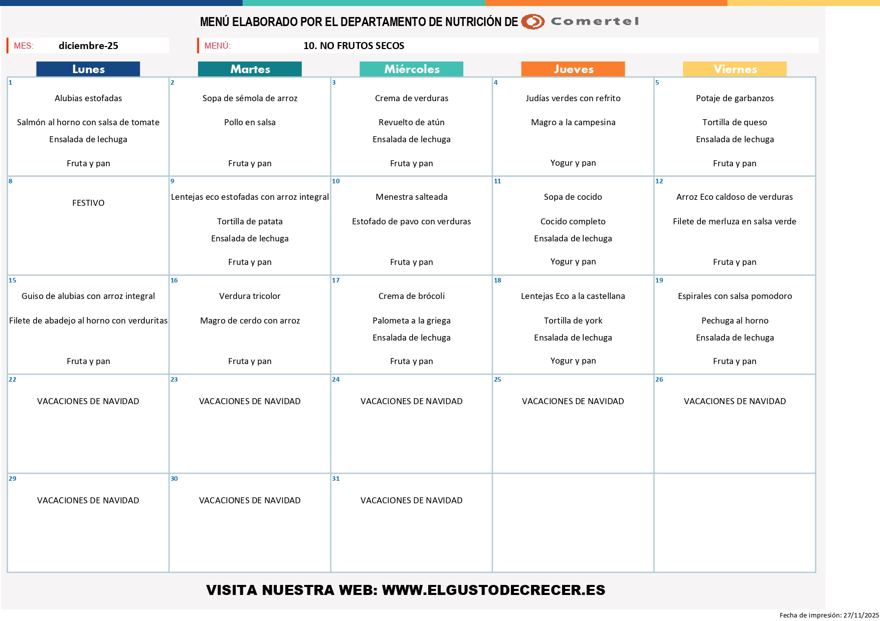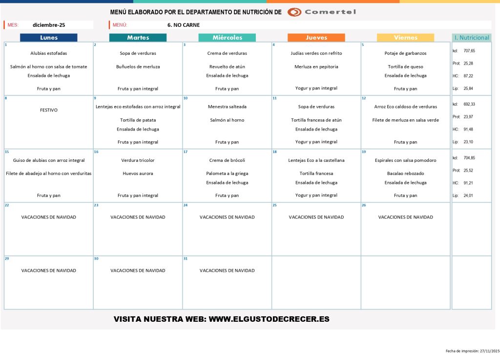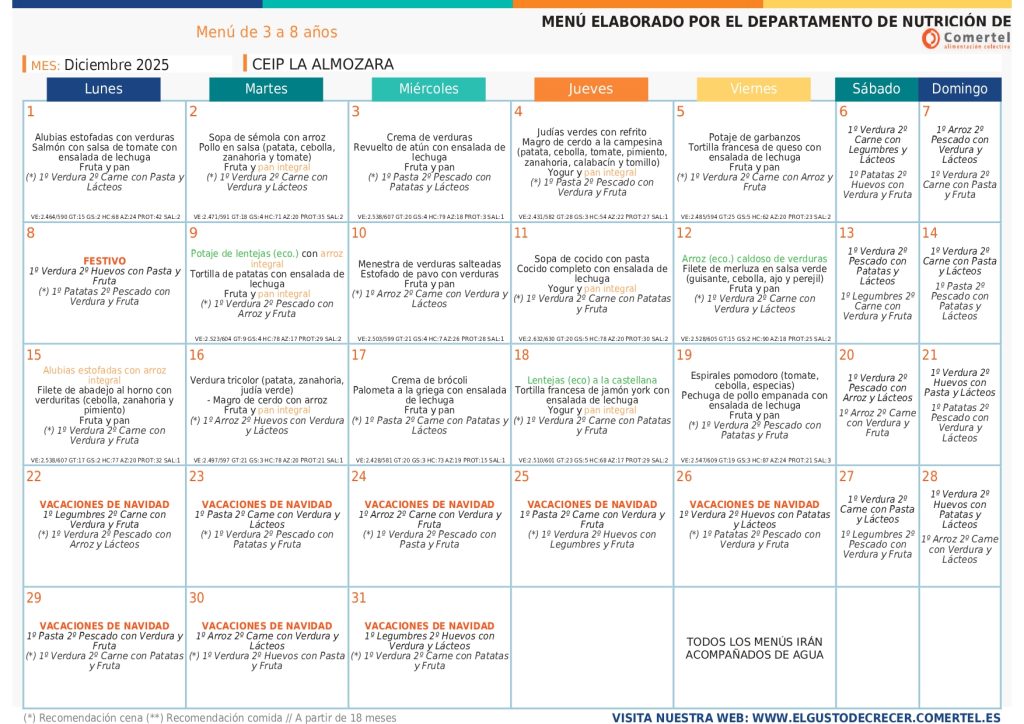 Existe la posibilidad de quedarse a comer días sueltos hasta un máximo de 7 días al mes. El precio de los menús ocasionales es de 6,20 euros. Dicha cantidad deberá ser abonada en secretaría con antelación o el mismo día a las nueve horas.